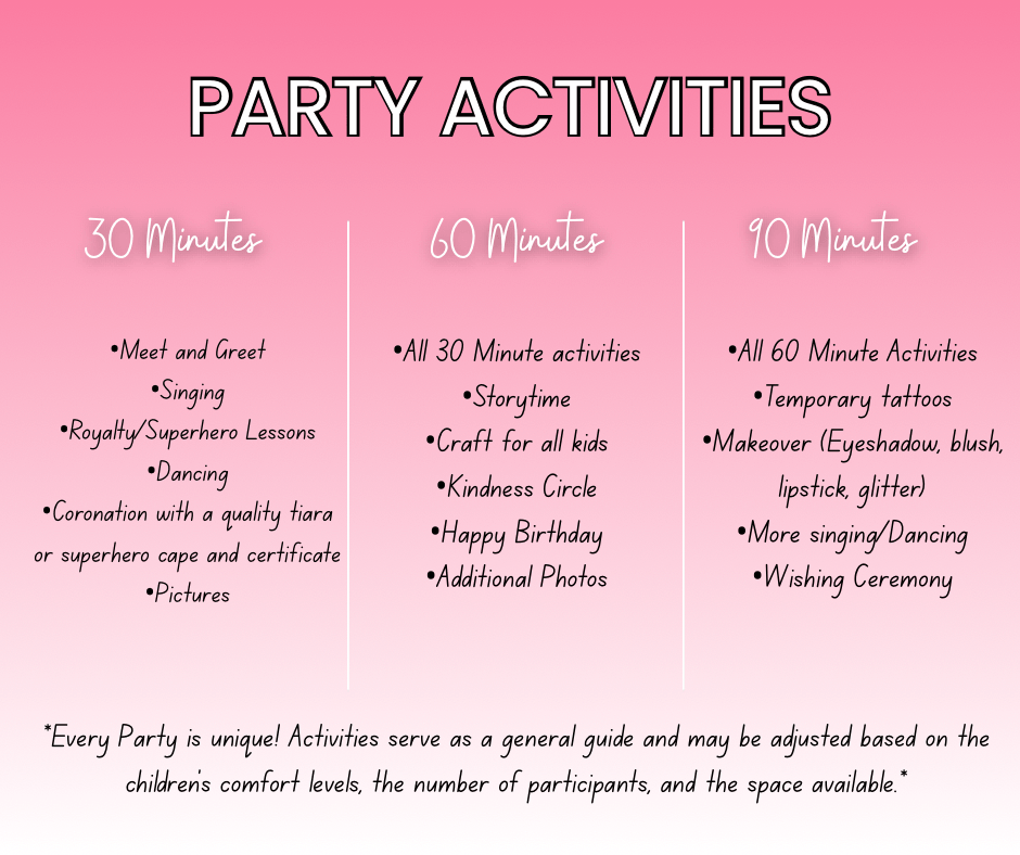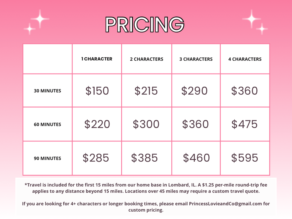 Princess Lovie Entertainment LLC is a fully licensed and insured business. They are not affiliated with the Walt Disney Company, Universal or Marvel, and any similarities to these characters is strictly coincidental.